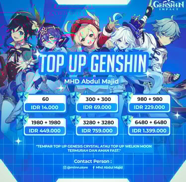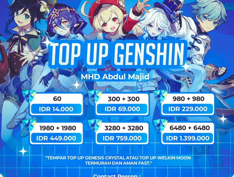 Kami melayani transaksi untuk Mobile Legends, Free Fire, PUBG Mobile, Valorant, Genshin Impact, Steam, dan lainnya.